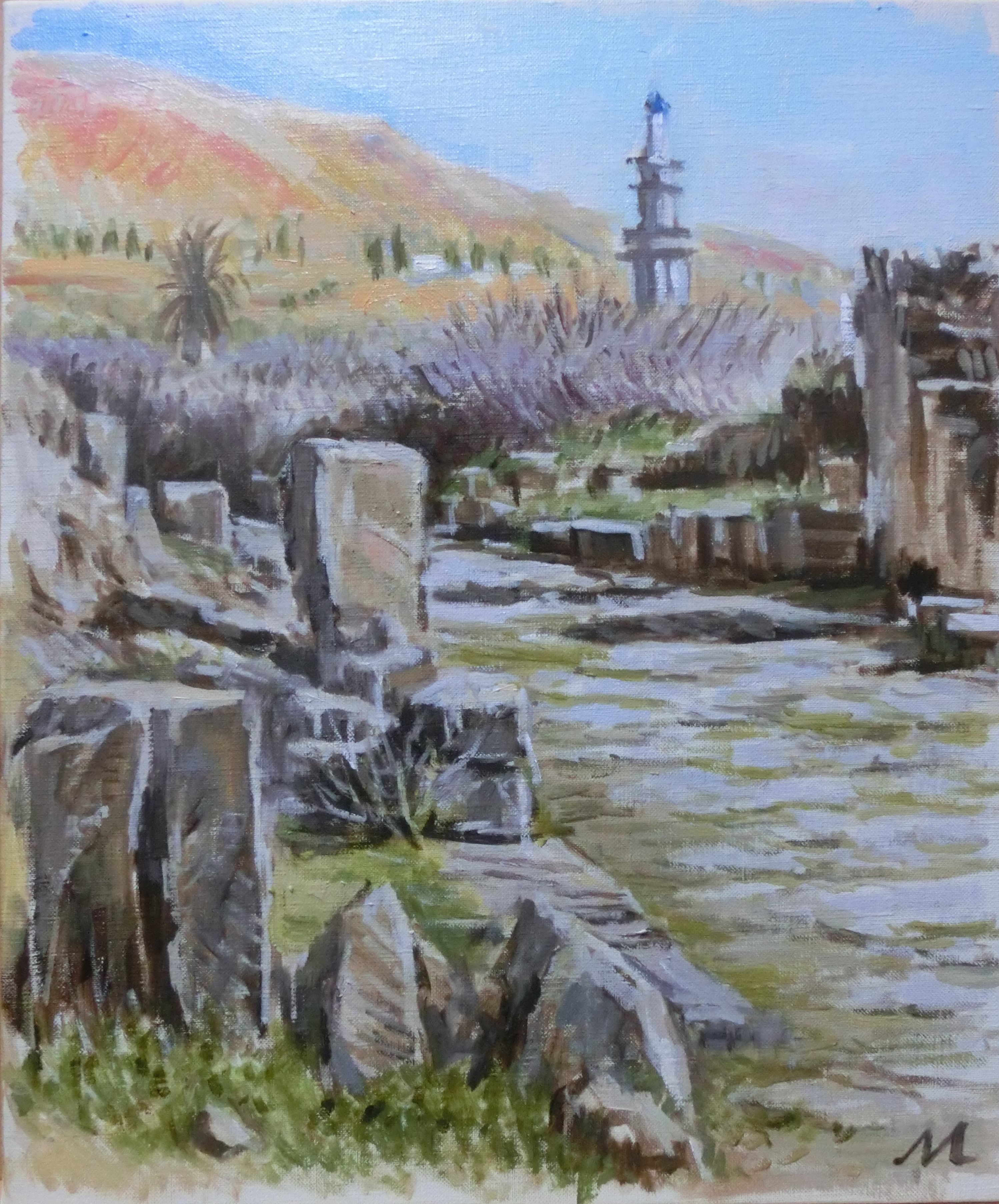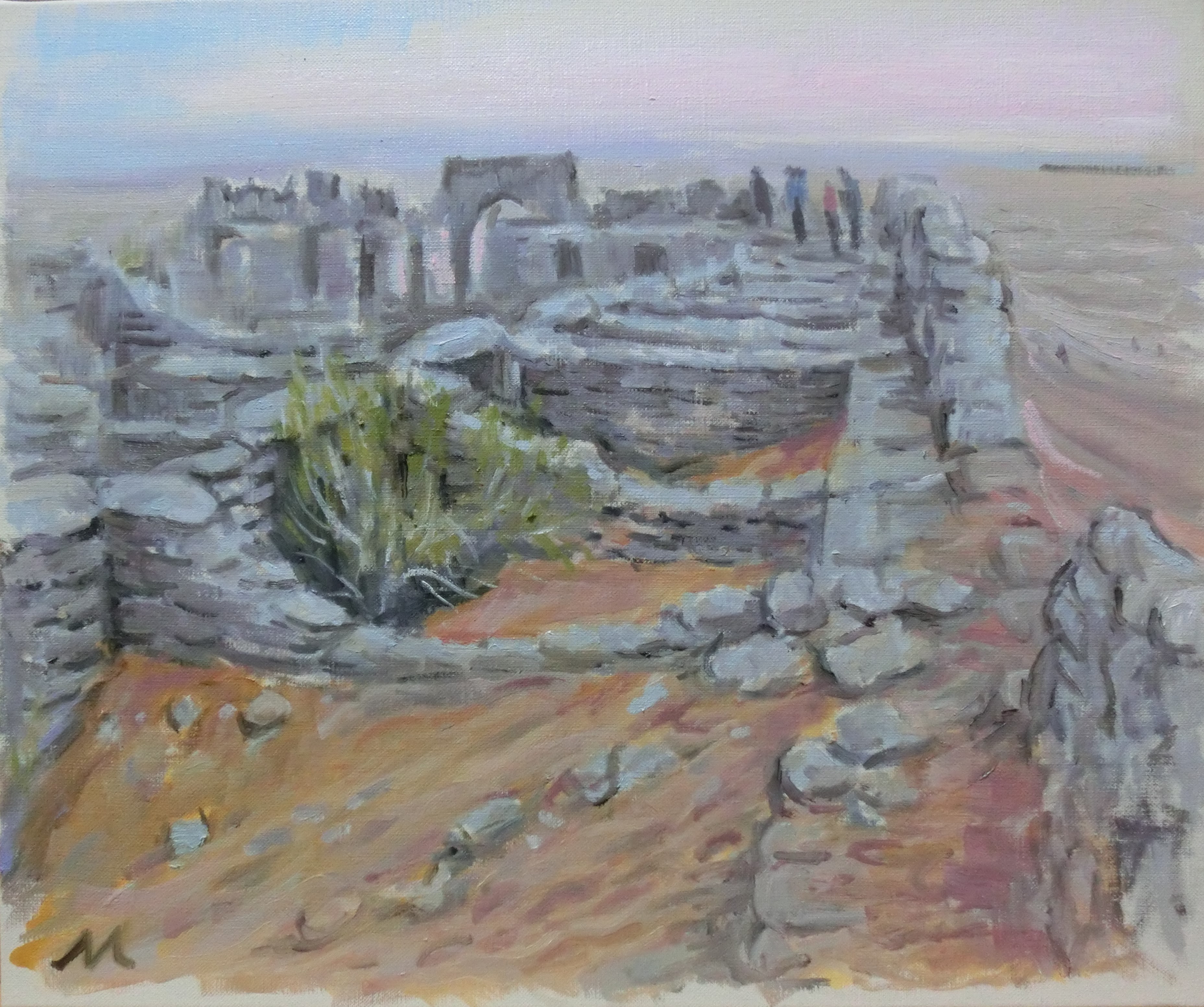 遺跡遠望 チュニジア F8 チュニスの西130㎞にある ブラデジアの遺跡。半地下住居 からはビザンチン時代の金貨 が大量に見つかり、モザイクが 綺麗に敷き詰められている。 赤茶けた山に白壁の家が見えた。 |
